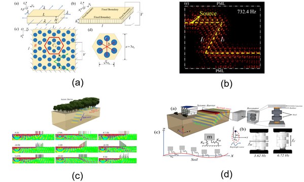 The recent surge in the number of studies on seismic metamaterials is testimony to the fact that the concept of photonic crystals, phononic crystals and acoustic metamaterials is no longer limited to basic theories and dynamic characteristics. Apart from the peculiar observation including negative stiffness, negative mass density negative refraction properties, etc., auxetic metamaterials that govern negative Poisson’s ratio, nonreciprocal wave phenomena, origami/kirigami effects also find potential applications in geophysics and earthquake engineering. Except man-made synthetic resonators/metastructures, recently forest trees at geophysical scale are reported as naturally available seismic metamaterials with capability to mitigate ground born ambient vibrations and incoming seismic waves at subwavelength frequency region. The work to be presented here elaborates a class of materials and structures ranging from engineered phononic crystals and acoustic metamaterials in Fig (a,b) to natural seismic metamaterials in Fig. (c,d) that show exotic yet with outstanding application potentials. Besides discussing the peculiar yet wonderful wave propagation characteristics of periodic structures for wave active control, topological protected interface modes, etc., the exciting wave dispersion response that found applications for manipulation Rayleigh wave and possible forestation as a means for geographical regional isolation against ground surface wave motion will also be presented.